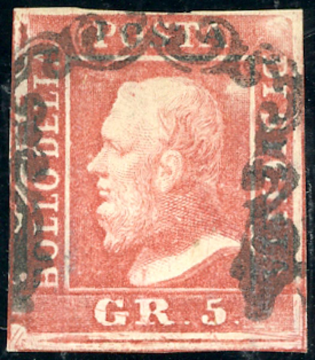 1859 - 5 grana rosa carminio, I tavola (9), usato, perfetto. Fresco, ottimi margini. Emilio, Alberto Diena, Ferrario.