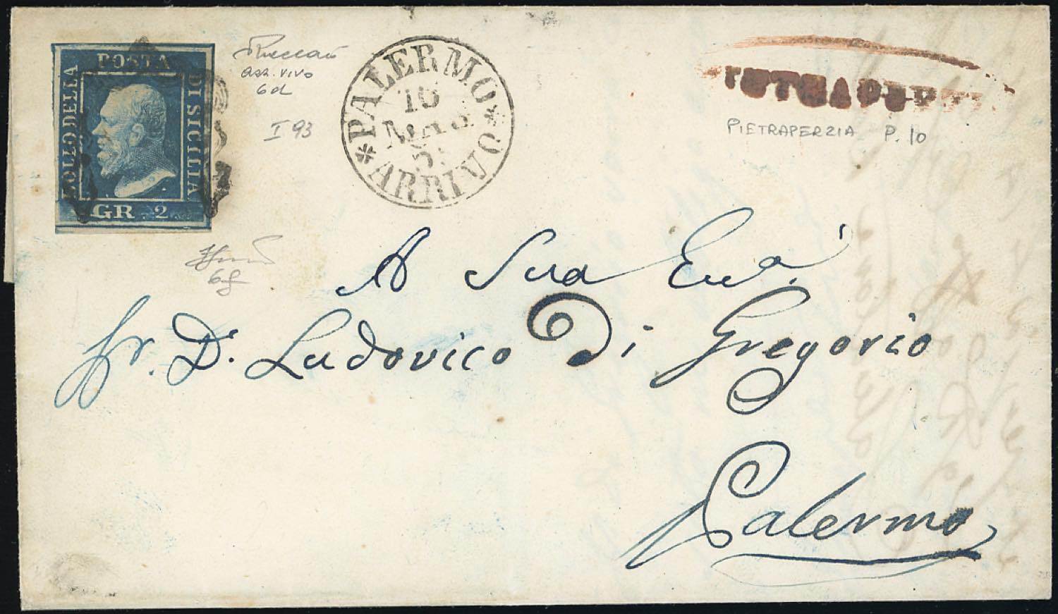 PIETRAPERZIA, punti 10 - 2 grana azzurro vivo, I tavola (6f), perfetto, su sovracoperta di lettera per Palermo 16/5/1859. Vaccari, Ferrario.
