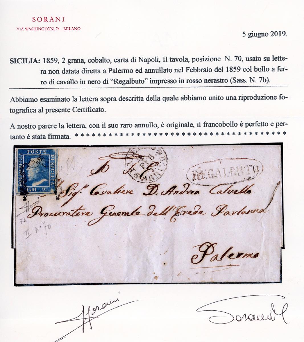 REGALBUTO, ovale rosso nerastro punti R1 - 2 grana, II tavola, posizione 70 (7b), perfetto, su fresca sovracoperta di lettera per Palermo 4/2/1860. Raro annullo. Em.Diena, cert. Sorani.
