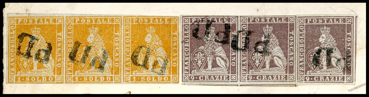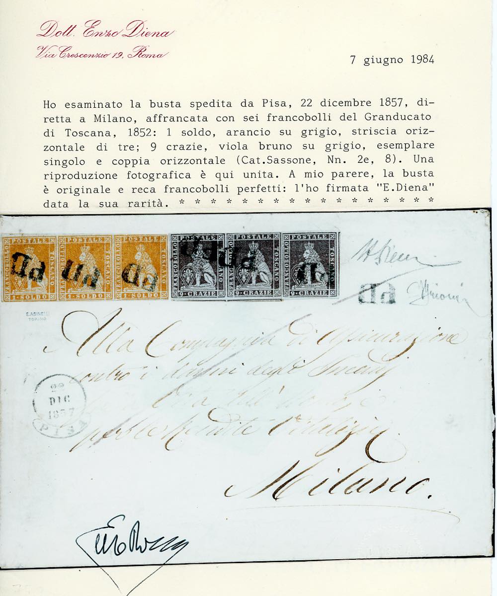 1857 - 1 soldo arancio su grigio, striscia orizzontale di tre, 9 crazie viola bruno su grigio, singolo e coppia (2e,8), ottimo stato, su busta da Pisa 22/12/1857 a Milano. Affrancatura multipla probabilmente UNICA, di grande impatto visivo. Da esposizione. Grioni, A.Diena, cert. E.Diena.