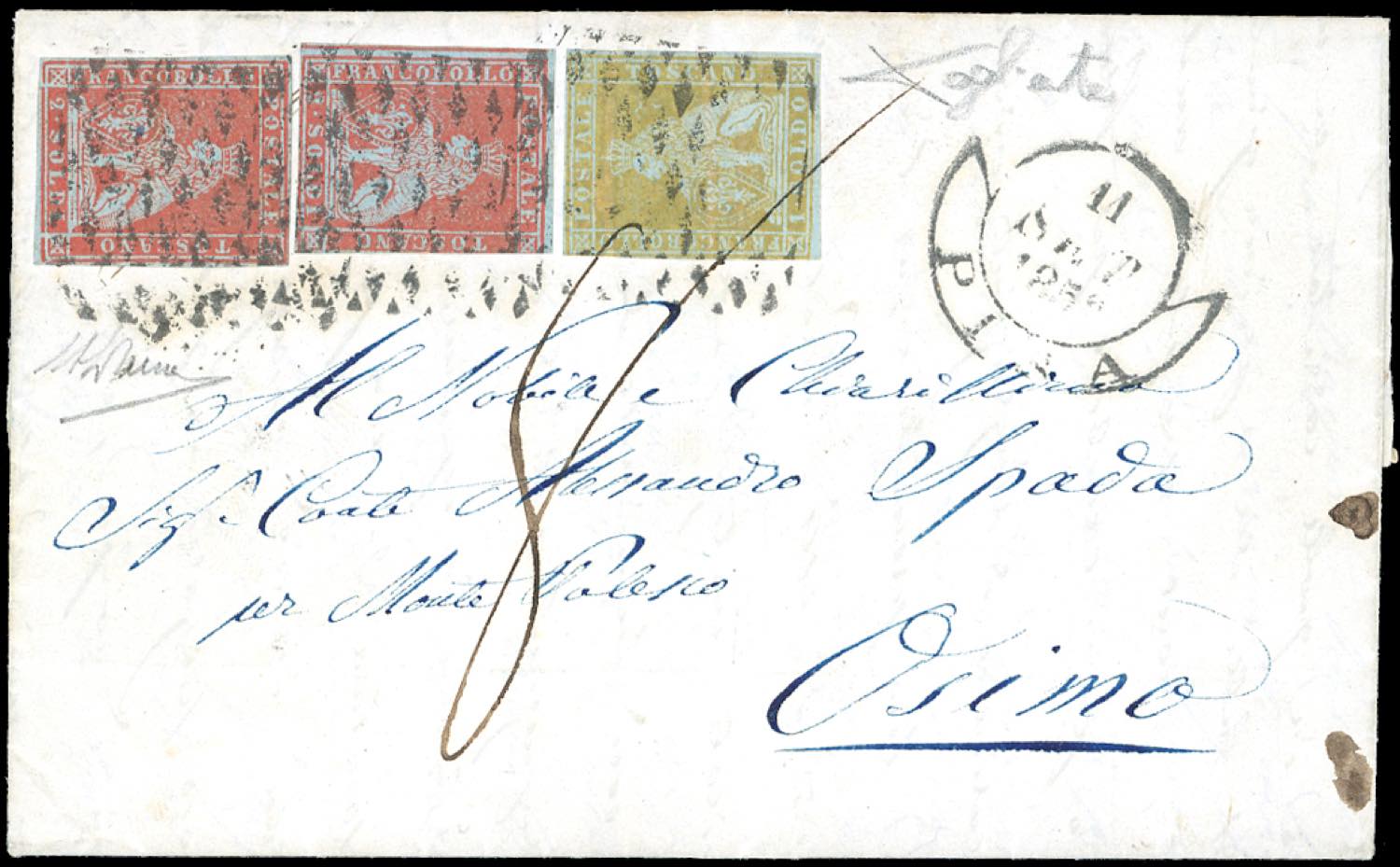 1852 - 2 soldi scarlatto, due esemplari, 1 soldo giallo limone, tutti su carta azzurra (3,2a), francobollo da 1 soldo perfetto, gli altri con un margine leggermente intaccato, su fresca lettera da Pisa 11/9/1852 ad Osimo, tassata 8 baj. Molto raro. Cert. A.Diena.