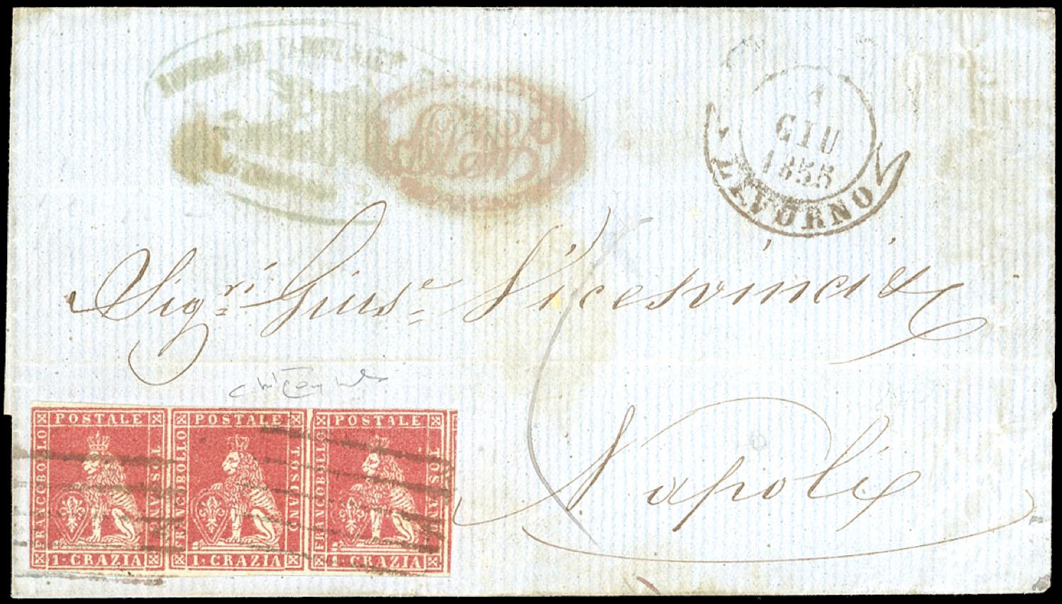 1855 - 1 crazie carminio su grigio (4d), striscia orizzontale di tre, molto fresca, margini a filo in alcuni punti, su lettera da Livorno 1/6/1853 a Napoli, tassata. Cert. Raybaudi.