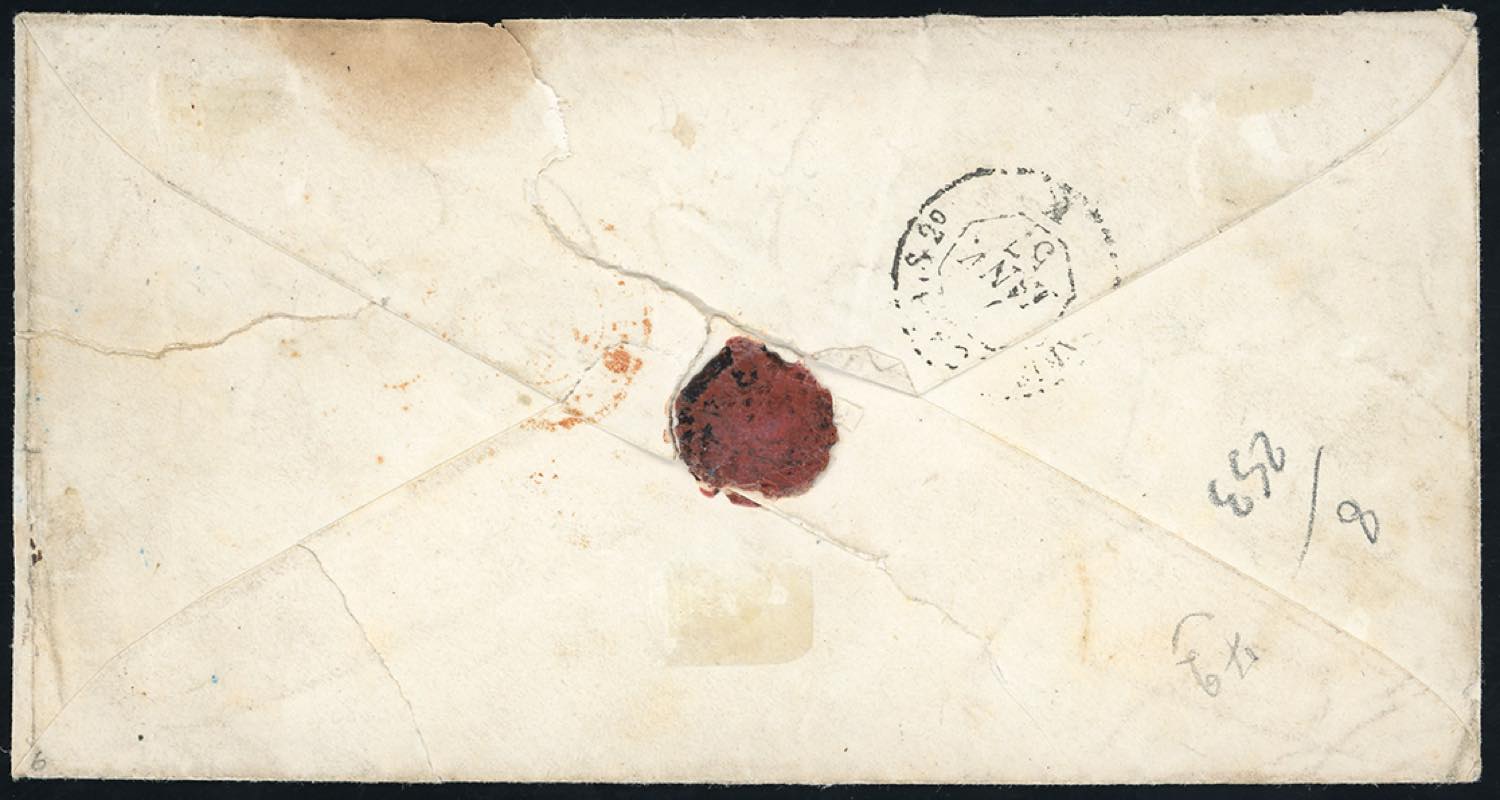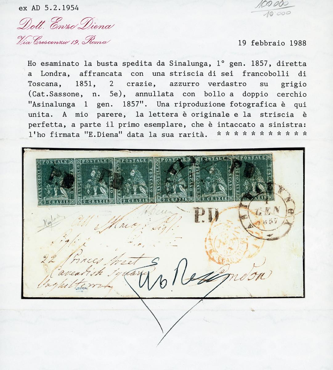 1857 - 2 crazie azzurro verdastro su grigio (5e), striscia orizzontale di sei, su busta da Asinalunga 1/1/1857 a Londra. La rarissima striscia è stata annullata sia con il bollo P.D. che con quello a doppio cerchio. Grande rarità. A.Diena, Raybaudi, cert. E.Diena per esteso.