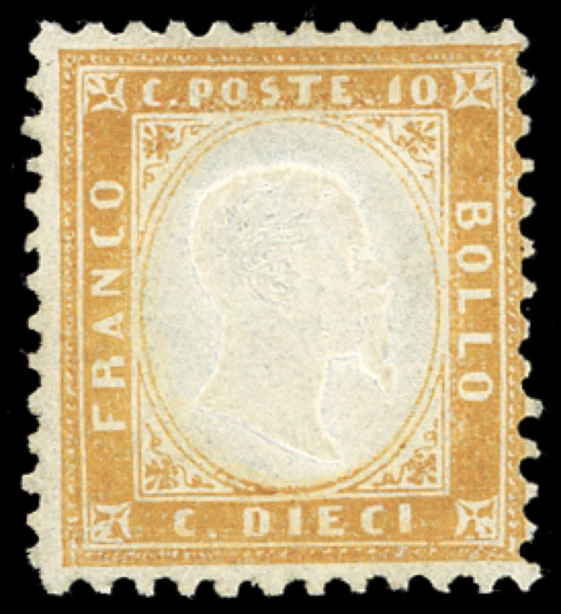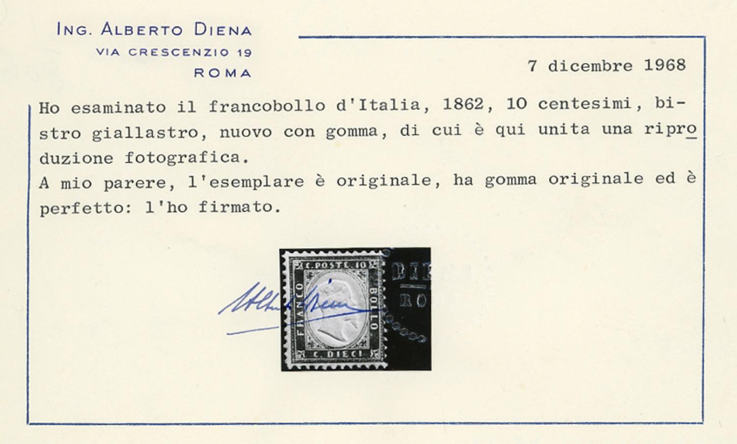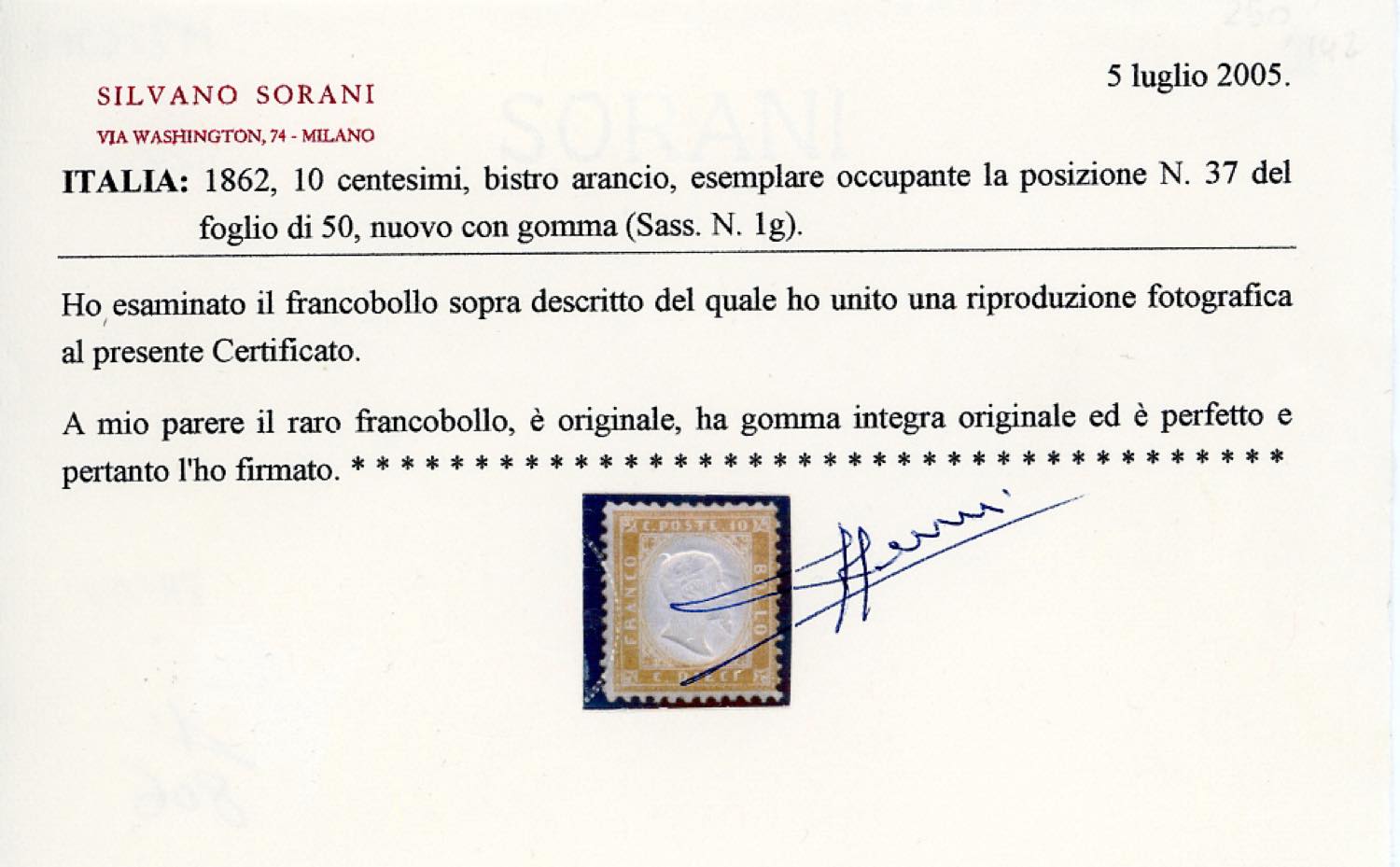 1862 - 10 cent. bistro arancio, posizione 37 del foglio (1g), nuovo, gomma originale integra, perfetto. Molto fresco e ben dentellato. Il francobollo, con effigie ben delineata, è accompagnato da cert. A.Diena che lo classifica come bistro giallastro (1) e da cert. Sorani che lo classifica bistro arancio (1). Rarità.