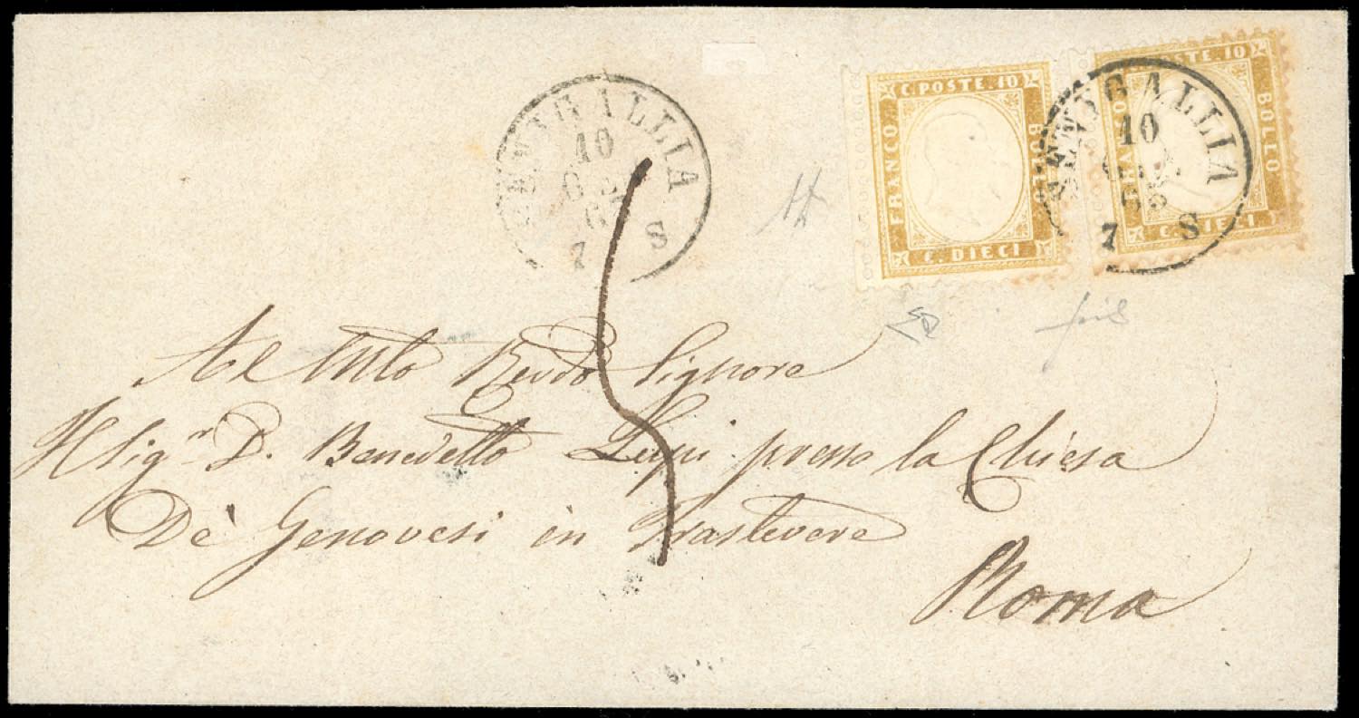 1863 - 10 cent. bistro giallastro (1), due esemplari, entrambi bordo di foglio a sinistra, perfetti, su lettera da Senigallia 10/1/1863 a Roma, tassata 5 baj. Molto bella. A.Diena, Fiecchi, cert. E.Diena.