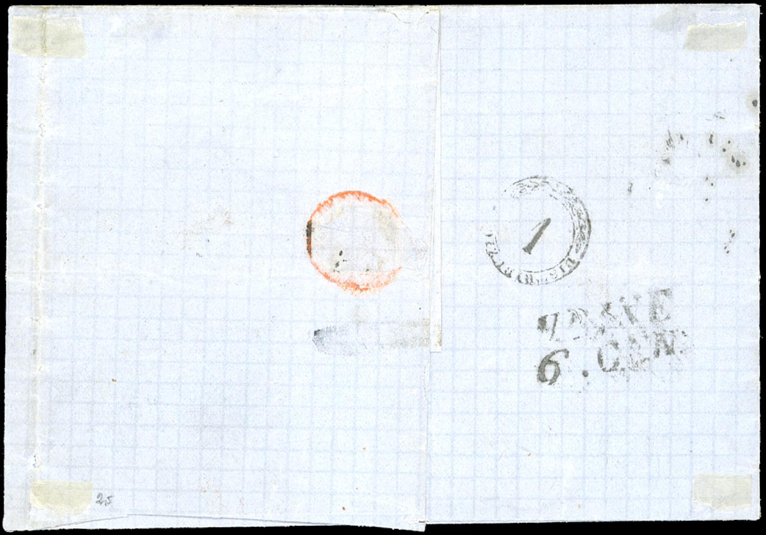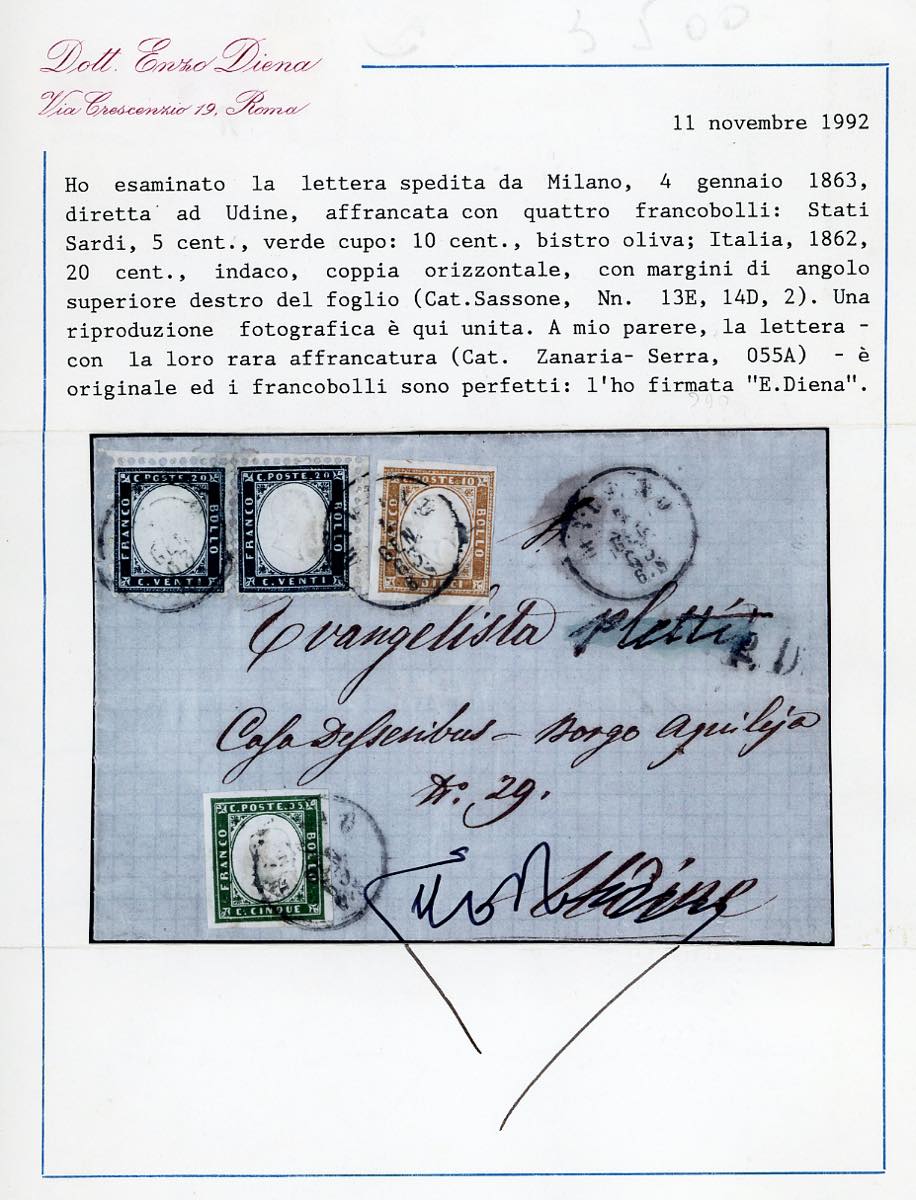 1863 - 20 cent. indaco (2), due esemplari, uno angolo di foglio, l'altro bordo, in affrancatura mista con 5 cent. verde cupo e 10 cent. bistro oliva IV emissione di Sardegna (13E,14D), su fresca lettera da Milano 4/1/1863 ad Udine. Rara combinazione tricolore, di ottimo aspetto. Cert. E.Diena per esteso.