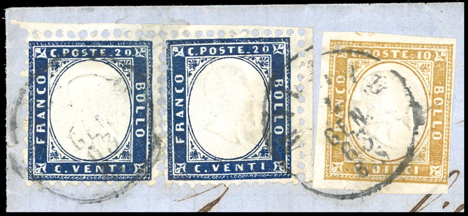 1863 - 20 cent. indaco (2), due esemplari, uno angolo di foglio, l'altro bordo, in affrancatura mista con 5 cent. verde cupo e 10 cent. ... Leggi tutto