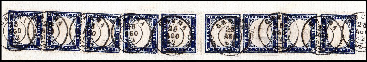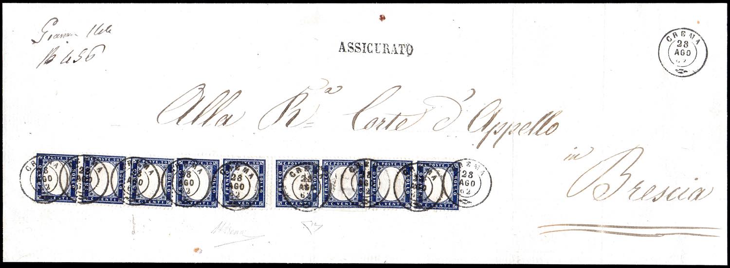 1862 - 20 cent. indaco con riflessi violacei (2a), nove esemplari, su fresco frontespizio completo di lettera assicurata di 7 porti da Crema 23/8/1862 a Brescia. Eccezionale affrancatura multipla monovalore. Si tratta in assoluto della terza più alta affrancatura nota formata esclusivamente da esemplari del 20 cent. Grande rarità dei Matraire dentellati. A. ed E.Diena.
