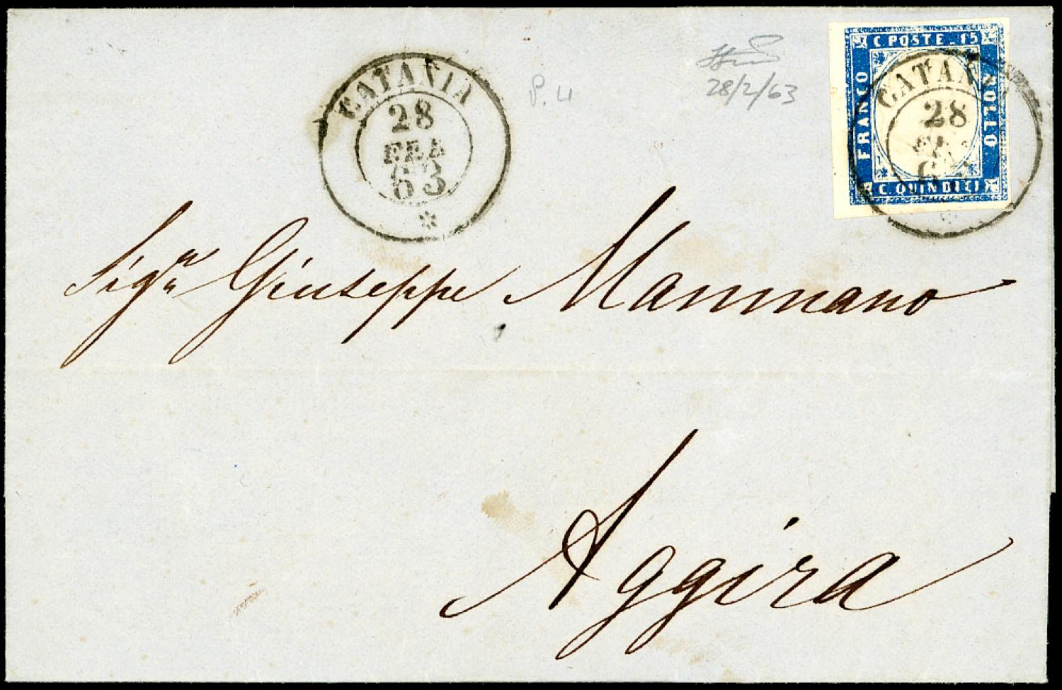 1863 - 15 cent. azzurro tipo Sardegna (11), perfetto, su lettera da Catania 28/2/1863 ad Aggira. ULTIMO GIORNO di validità ufficiale prima della proroga al 31/12/1863. Interessante. Ferrario.