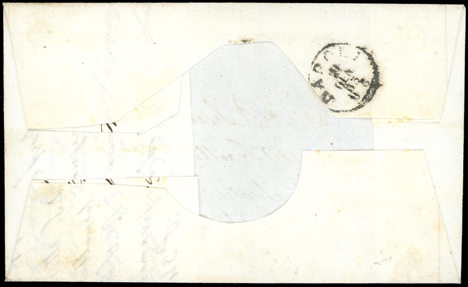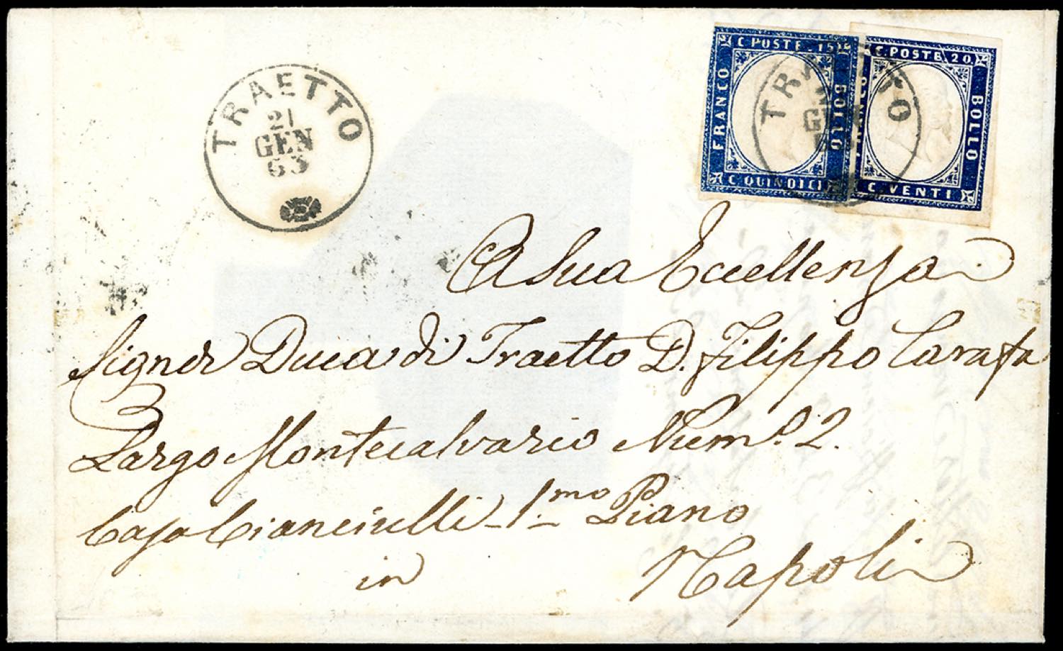 1863 - 15 cent. azzurro scuro tipo Sardegna (11b), in affrancatura mista con 20 cent. indaco, IV emissione di Sardegna (15E), su lettera, parzialmente incompleta al verso, da Traetto 21/1/1863 a Napoli. L'affrancatura di 35 cent. corrisponderebbe ad una lettera semplice contenente campioni senza valore. Rarissima affrancatura mista Sardegna-Italia, della quale sono noti meno di 5 casi.