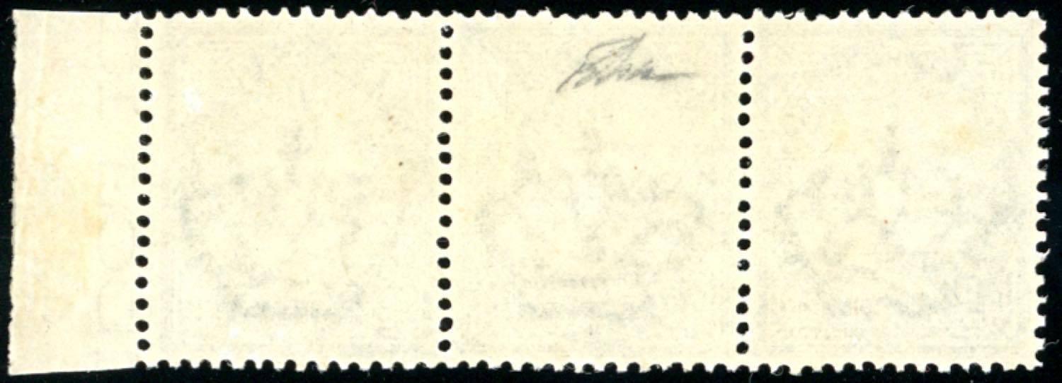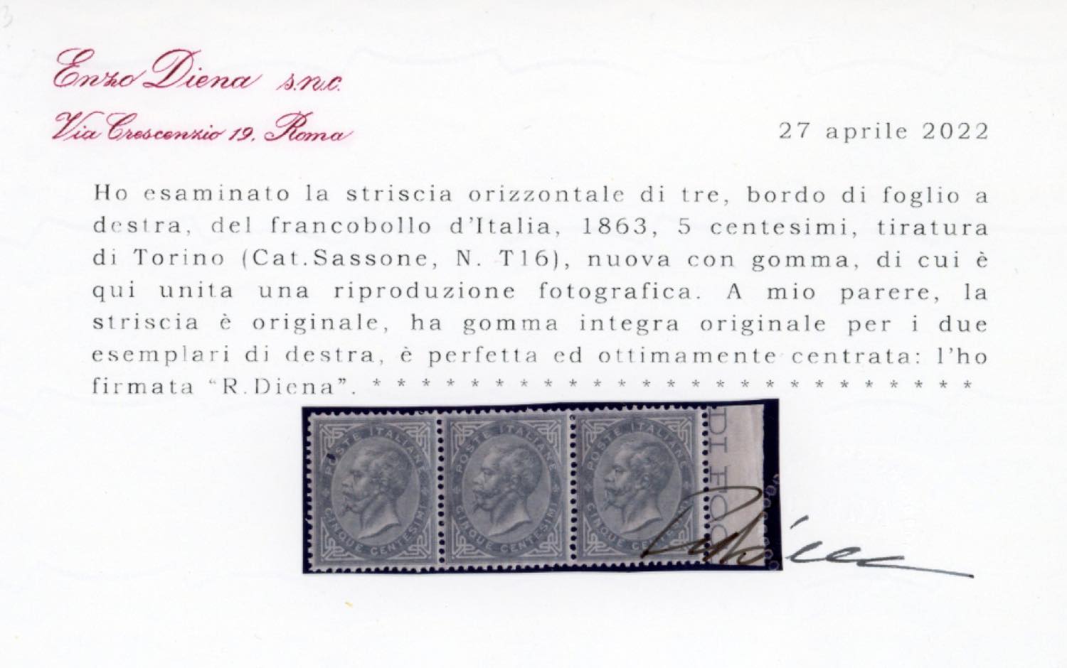 1866 - 5 cent. verde grigio scuro, De La Rue, tiratura di Torino (T16), striscia orizzontale di tre, bordo di foglio, nuova, gomma originale integra, perfetto. Splendida ed ottimamente centrata. Molto rara. Cert. Diena.