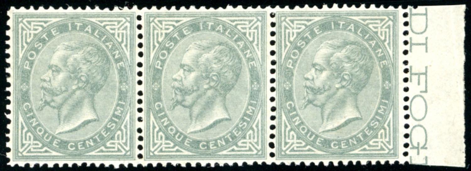 1866 - 5 cent. verde grigio scuro, De La Rue, tiratura di Torino (T16), striscia orizzontale di tre, bordo di foglio, nuova, gomma ... Leggi tutto