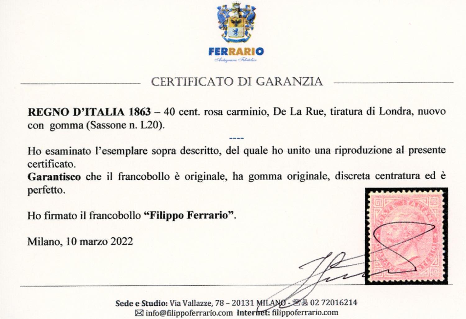 1863 - 40 cent. De La Rue, tiratura di Londra (L20), discreta centratura, gomma originale, perfetto. Raro. Cert. Ferrario.