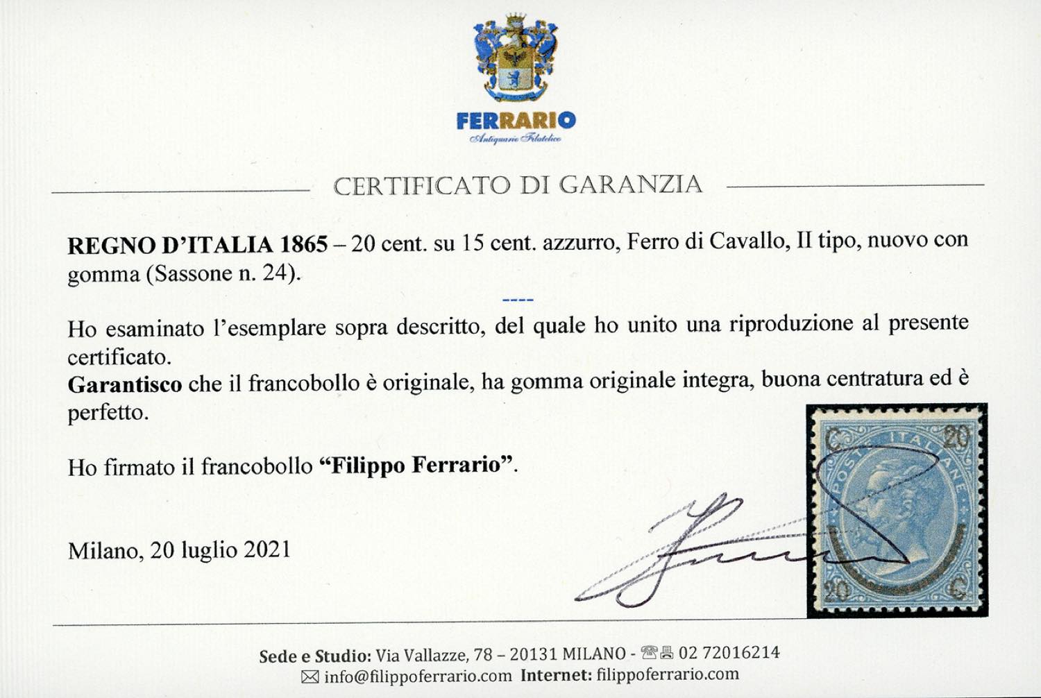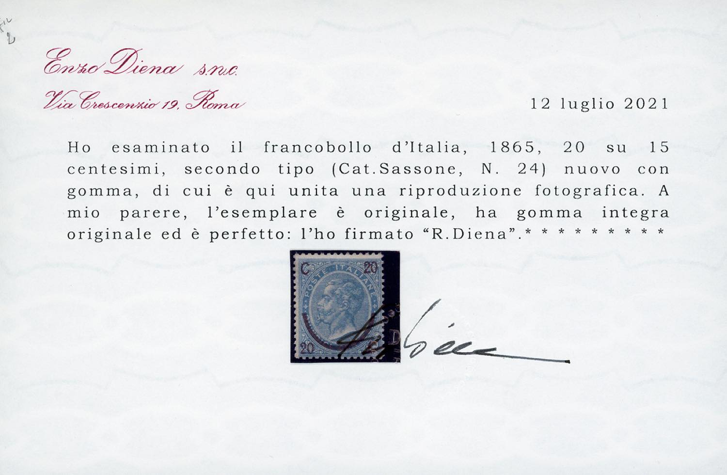 1865 - 20 cent. su 25 cent. Ferro di cavallo, II tipo (24), discreta centratura, gomma originale integra, perfetto. A.Diena, G.Oliva, cert. Ferrario e Diena (cat.Sassone € 13.000/35.000).