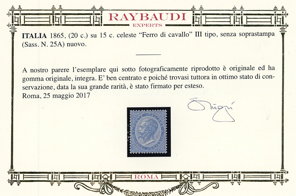 1865 - (20 cent.) su 15 cent. celeste SENZA SOPRASTAMPA (25a), nuovo, gomma originale integra, perfetto. Splendido per freschezza e centratura , uno dei migliori esemplari esistenti di questo rarissimo francobollo. Cert. Oro Raybaudi e Diena.