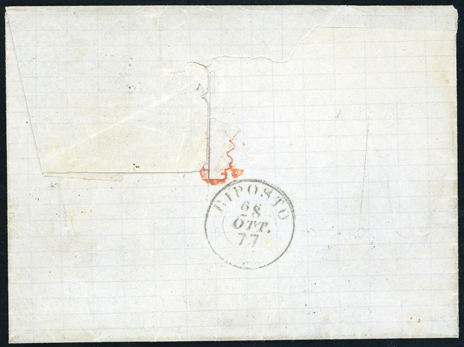 1877 - 20 cent. azzurro, tiratura di Torino (T26), perfetto, su lettera da Gaeta 24/10/1877 a Riposto, tagli di disinfezione. Raro uso di questo francobollo quasi due mesi dopo le fine della sua validità postale (31/8/1877), non tassato. Per specialista. Cert. Chiavarello.