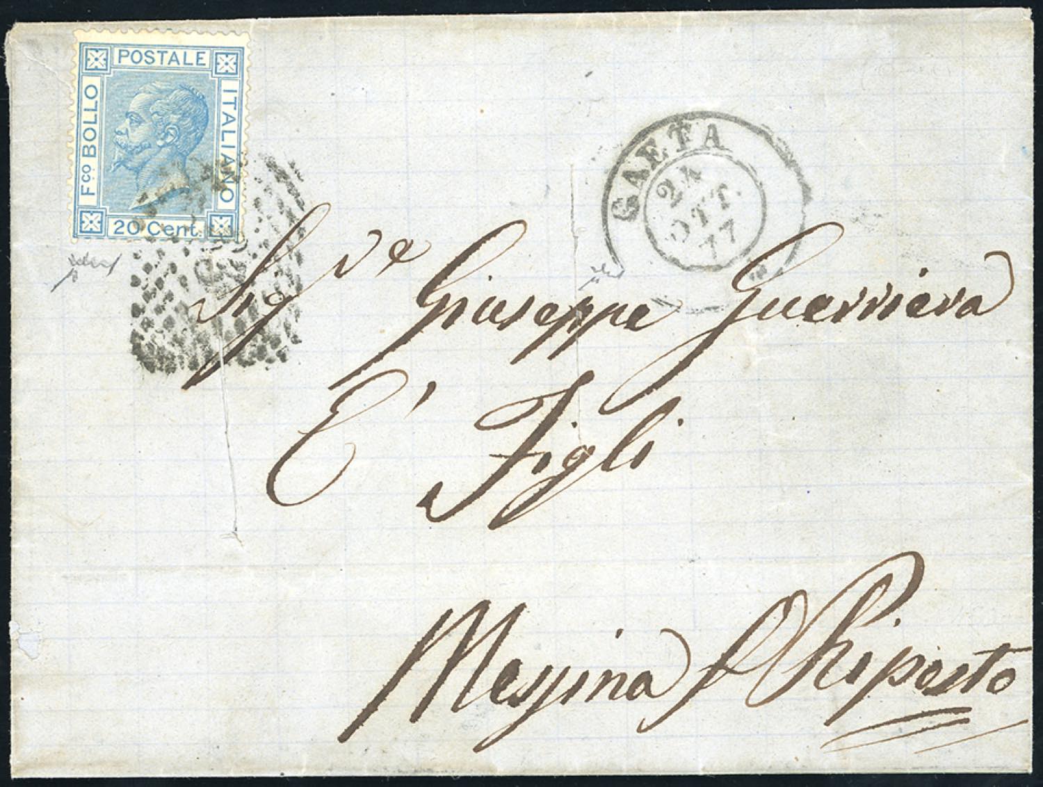 1877 - 20 cent. azzurro, tiratura di Torino (T26), perfetto, su lettera da Gaeta 24/10/1877 a Riposto, tagli di disinfezione. Raro uso di ... Leggi tutto