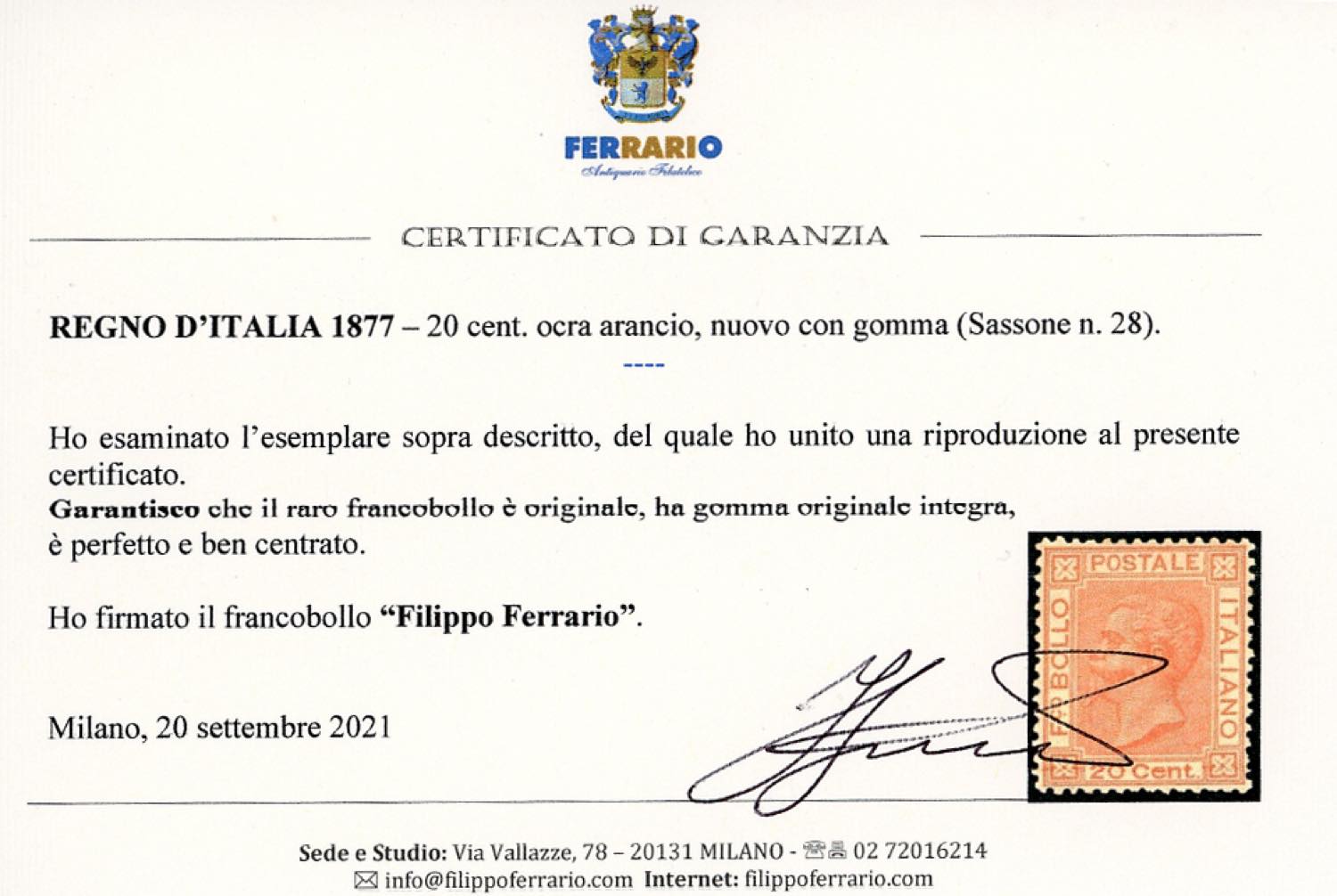 1877 - 20 cent. ocra arancio (28), nuovo, gomma originale integra, perfetto. Freschissimo e ben centrato. Cert. Diena e Ferrario.