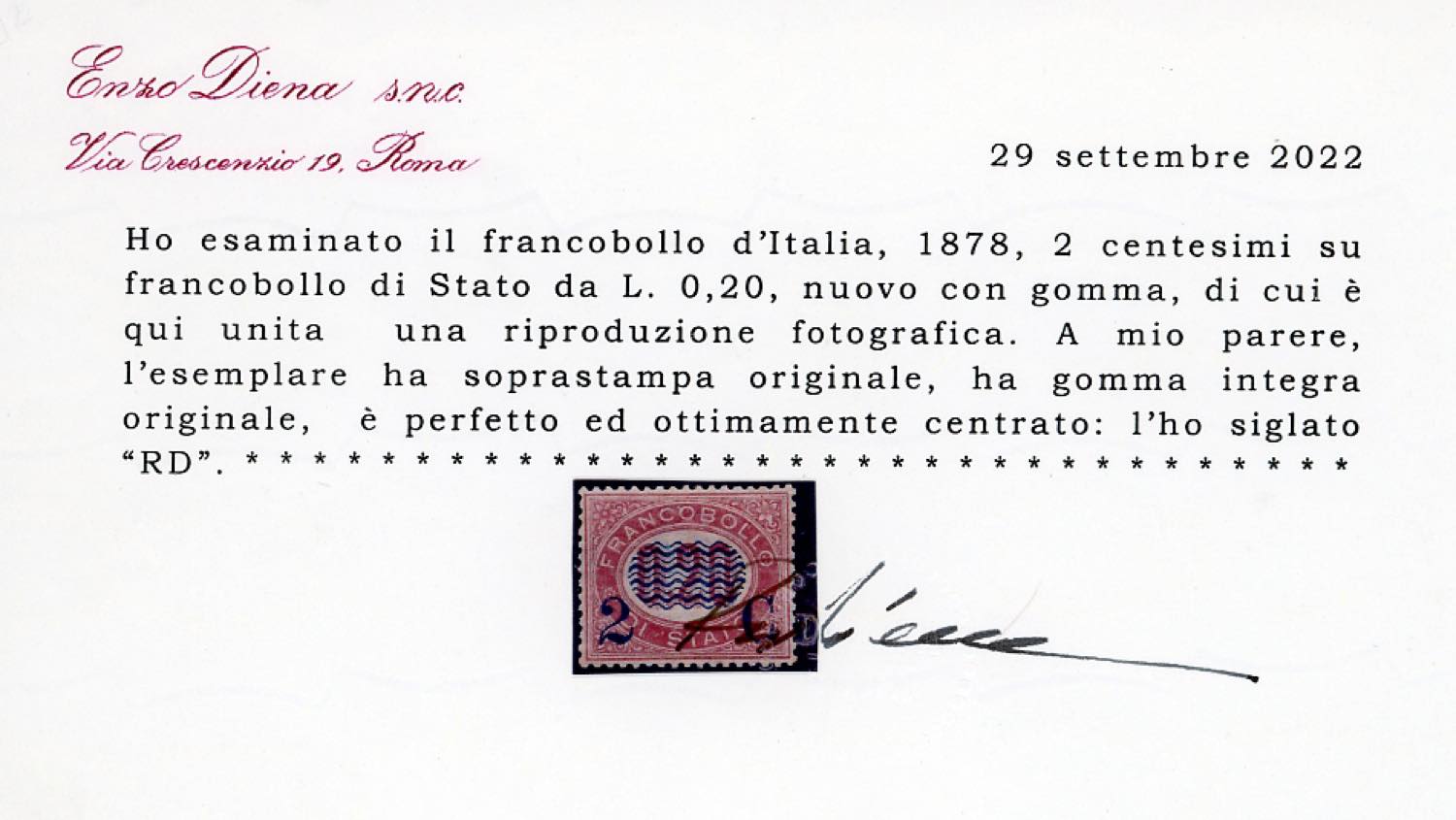 1878 - 2 cent. su 0,20 lire Servizio soprastampati (31), ottima centratura, gomma originale integra, perfetto e molto fresco. Splendido e raro in queste condizioni. Raybaudi, cert. Diena.