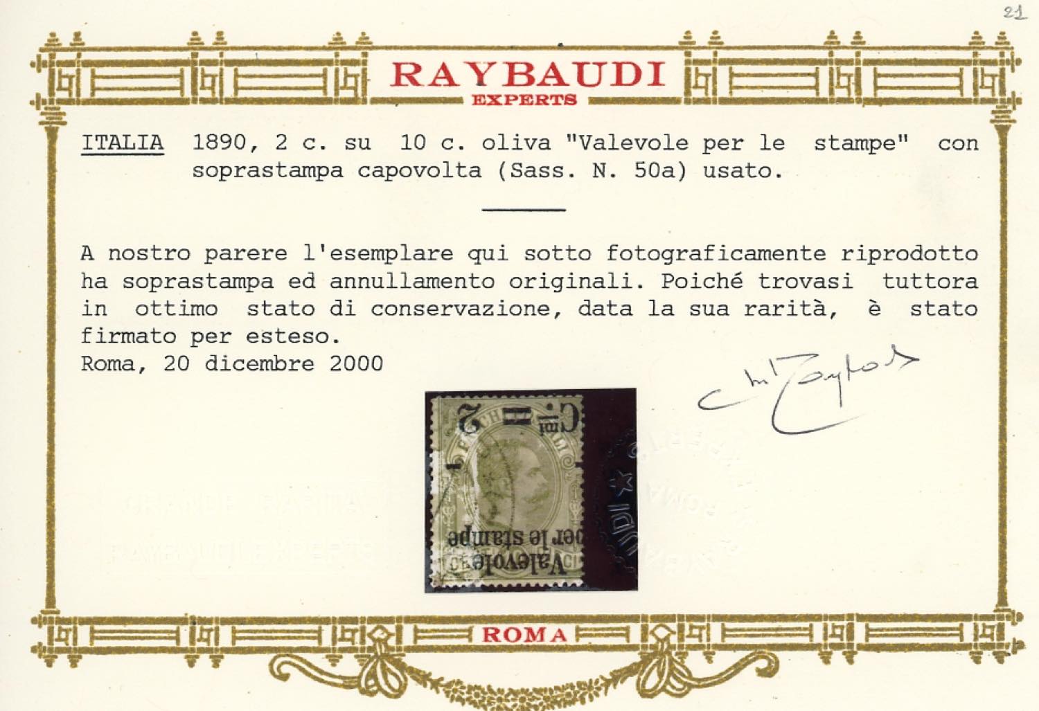 1890 - 2 cent. su 10 cent. Valevole per le stampe, soprastampa capovolta (50a), usato, perfetto. Raro. Fiecchi, cert. Oro Raybaudi.