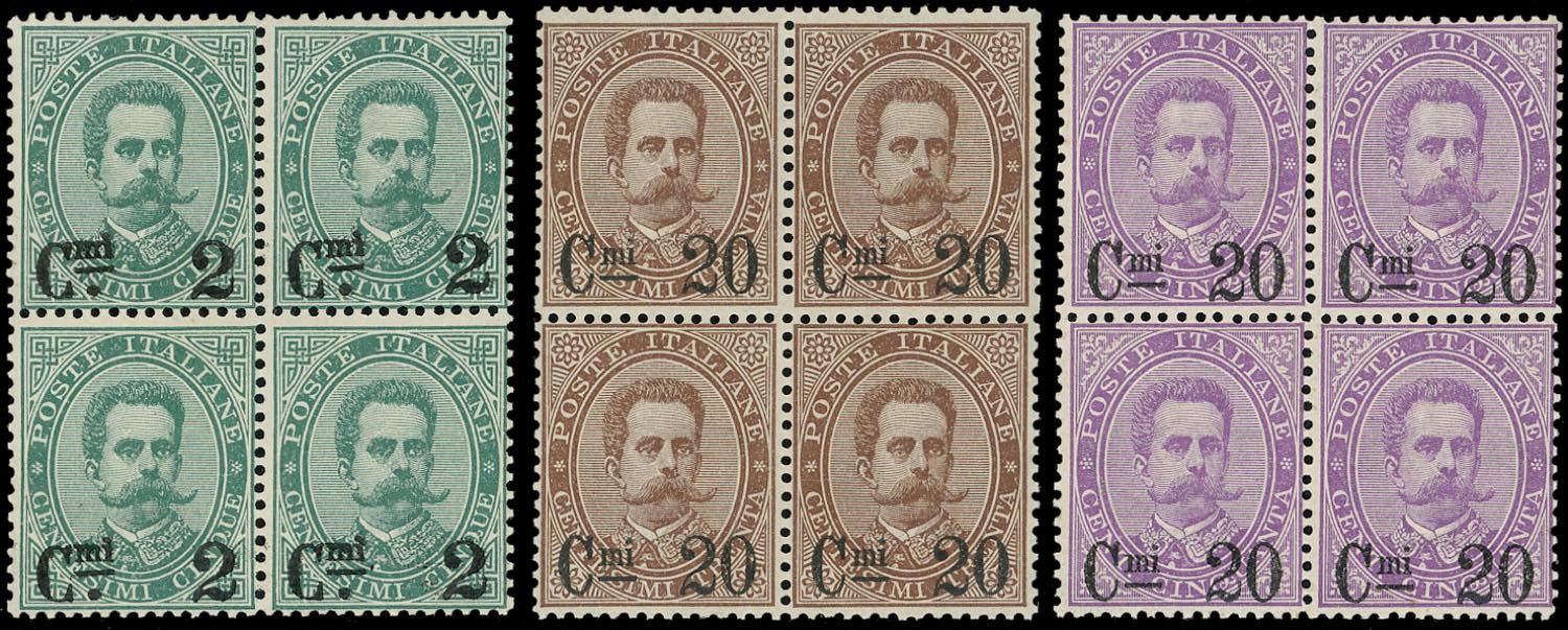 1890/91 - Soprastampati (56/58), blocchi di quattro, buona centratura, gomma originale integra, perfetti. Splendidi e rari! Cert. Ferrario.