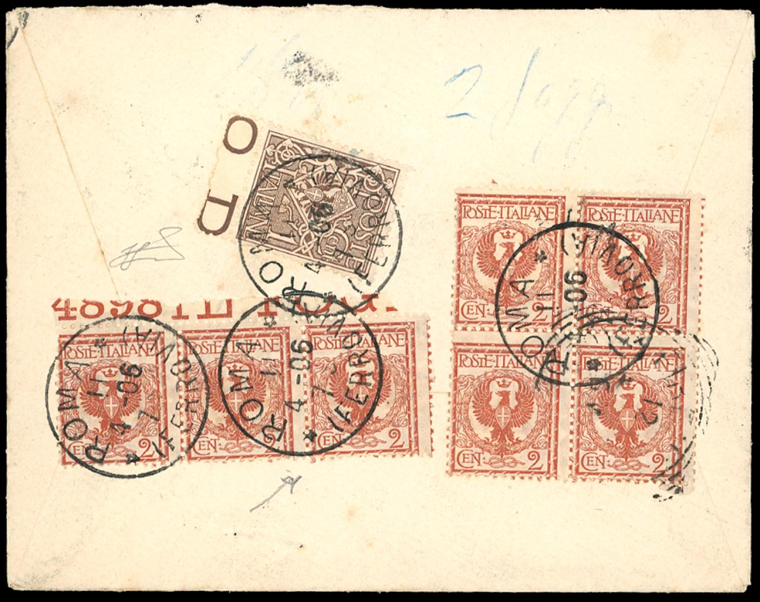 1906 - 2 cent. Floreale, striscia orizzontale di tre, bordo di foglio in alto con parziale numero di tavola "4898", e blocco di quattro, 1 cent. Floreale (68,69), perfetti, al verso di busta da Roma 11/4/1906 a Firenze. Molto rara. Ferrario.