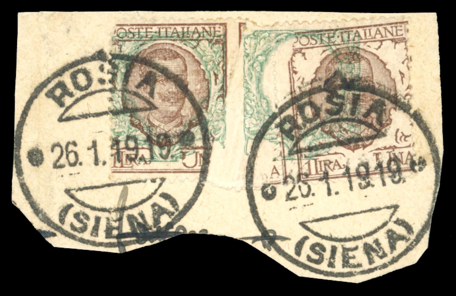 1901 - 1 lira Floreale (77), coppia orizzontale con la stampa del bruno e del verde fortemente spostate a causa di una piegatura della carta, usata su frammento a Roisa 26/1/1919. Varietà eccezionale e d'effetto, non catalogata.