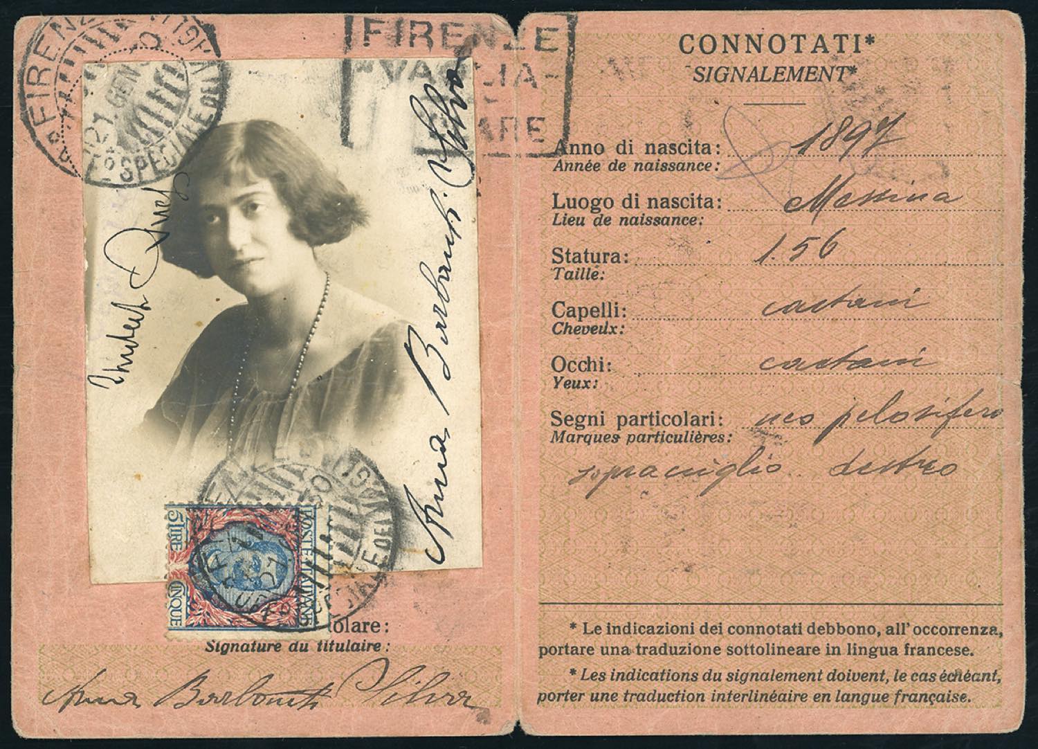 1930 - 5 lire Floreale (78), perfetto, isolato su tessera di riconoscimento postale annullato a Firenze 21/1/1930.