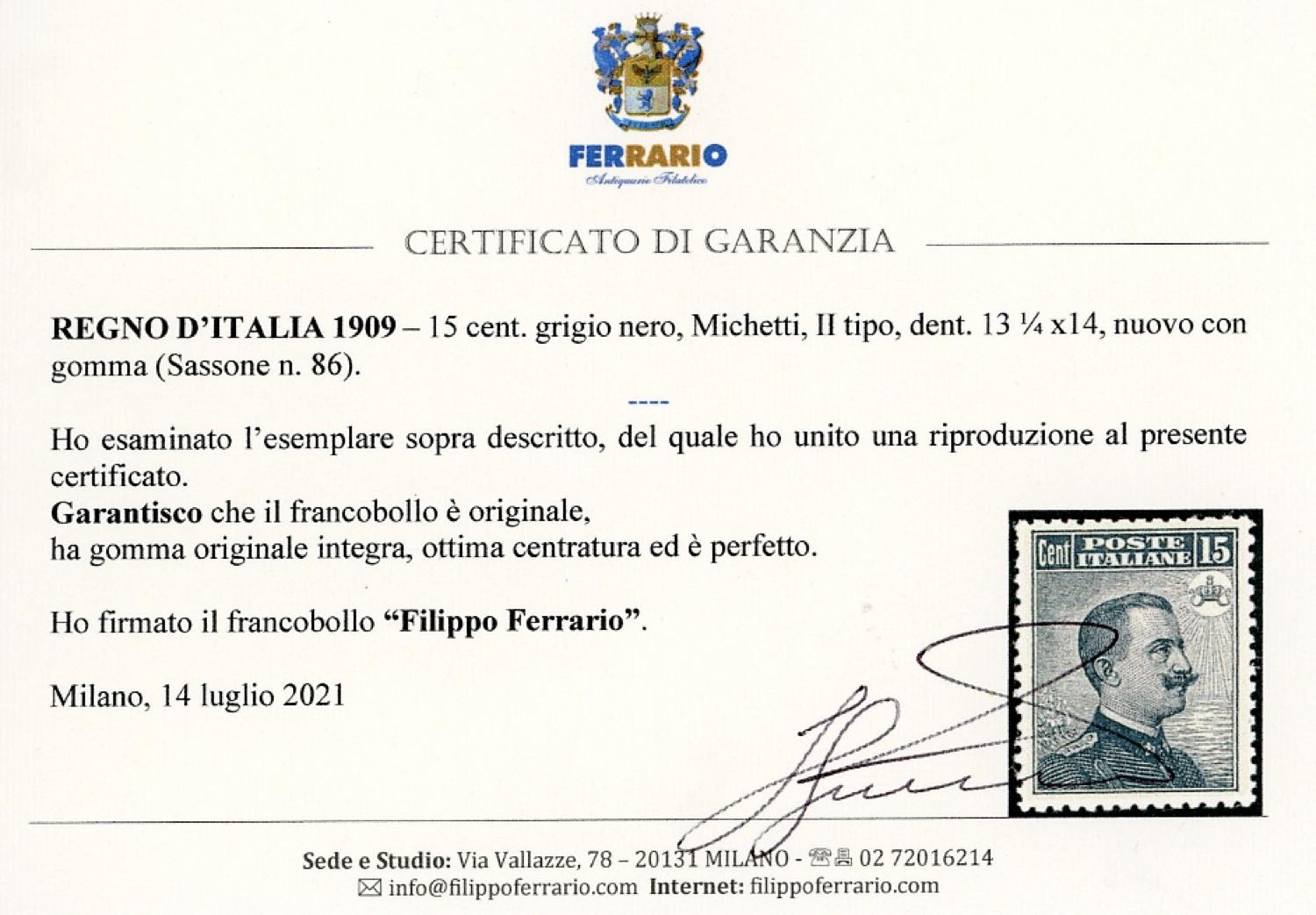 Lotto 1305 - 1909 - 15 cent. Michetti, II tipo (86), ottima centratura, ...