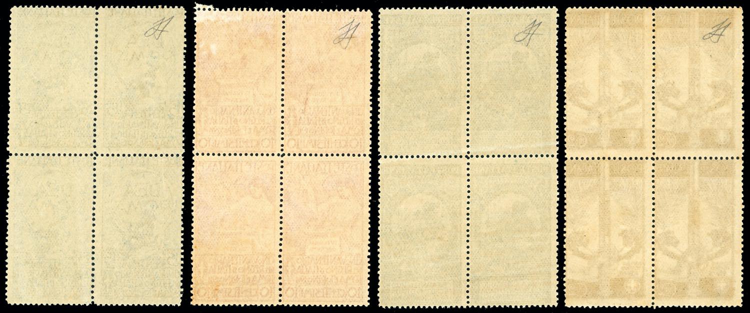 1911 - Unità d'Italia, serie completa (92/95), blocchi di quattro, nuovi, gomma originale integra, perfetti. Molto freschi. Ferrario.