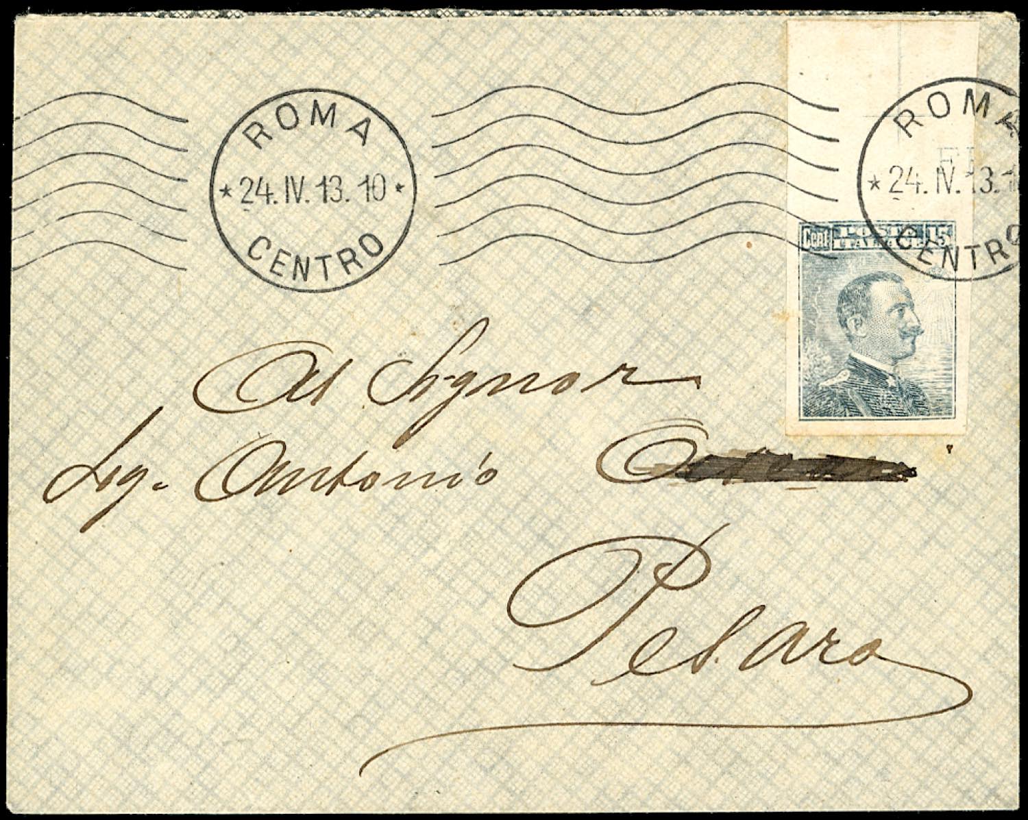 1913 - 15 cent. Michetti, III tipo, non dentellato (96e), perfetto, bordo di foglio in alto, su busta da Roma 24/4/1913 a Pesaro, bollo ... Leggi tutto
