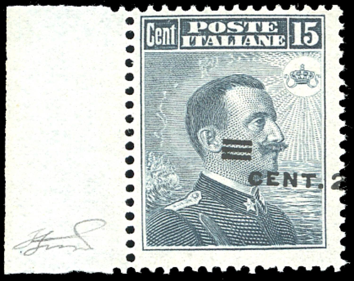 1916 - 20 cent. su 15 cent. Michetti soprastampato (106), varietà soprastampa parziale obliqua e spostata in basso, solo una fila di ... Leggi tutto