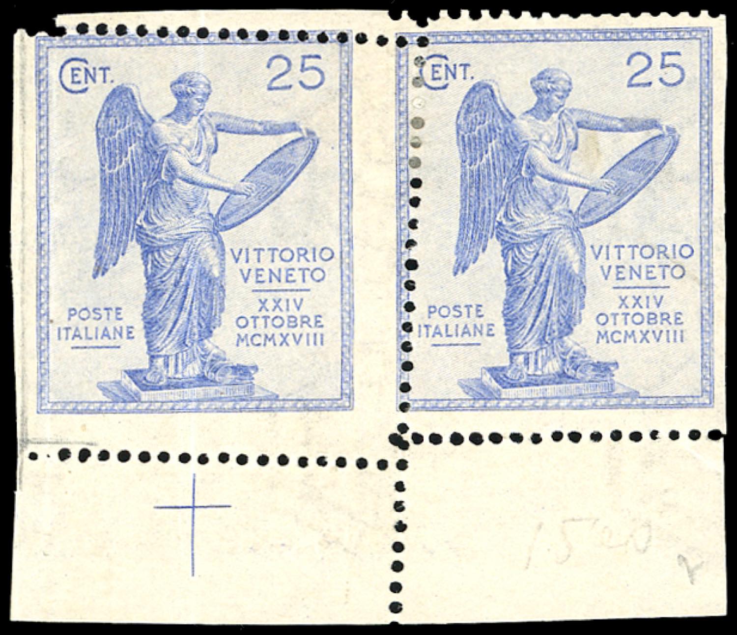 1921 - 25 cent. Vittoria (122), coppia orizzontale, un esemplare con evidente varietà di dentellatura (slittamento obliquo del pettine ... Leggi tutto