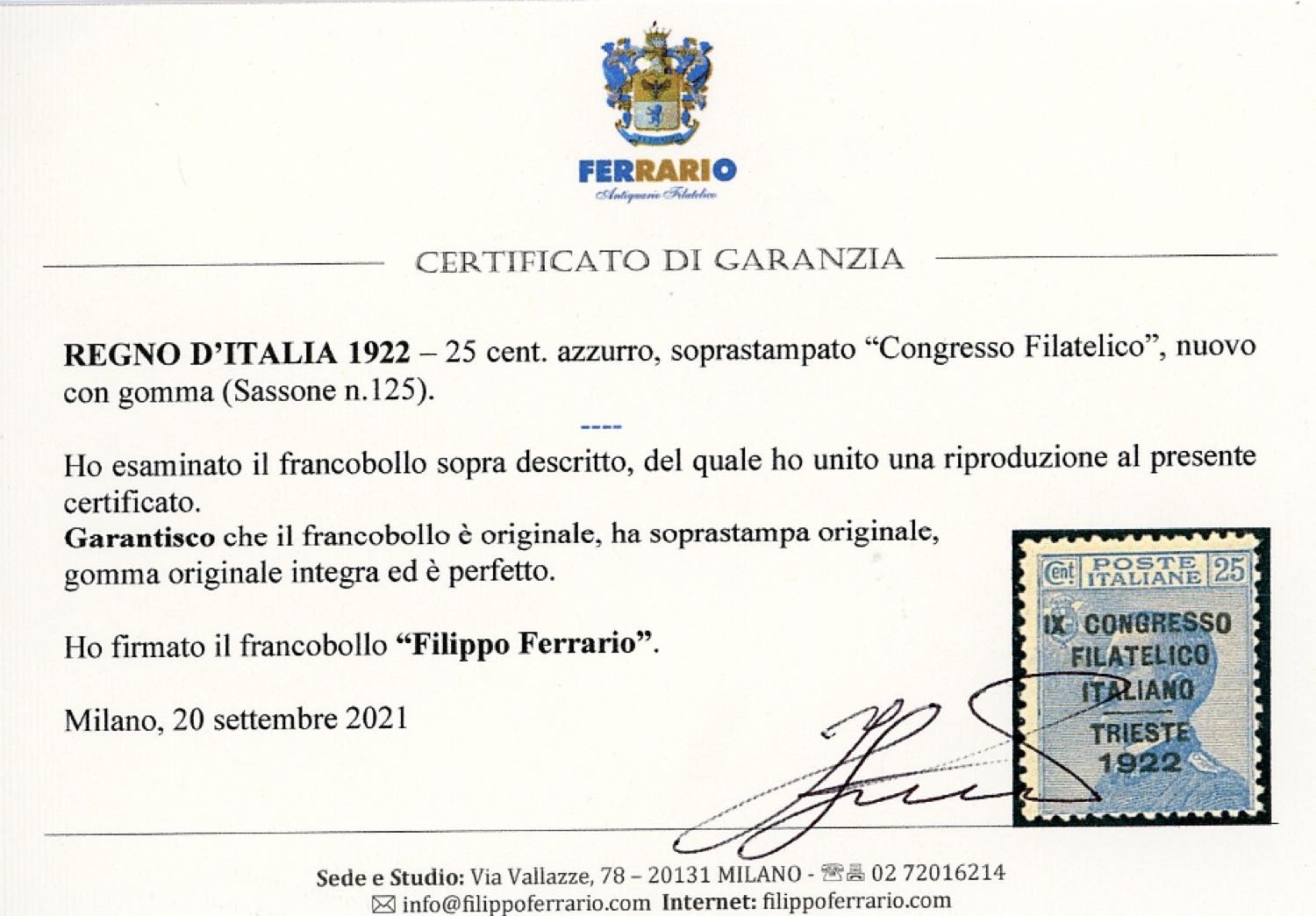 1922 - 25 cent. soprastampato "Congresso Filatelico" (125), nuovo, gomma originale integra, perfetto. Cert. Ferrario.