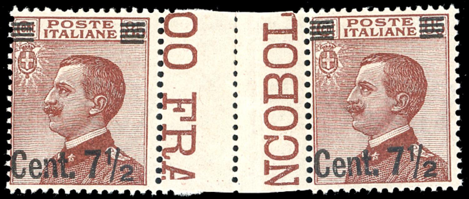 1924 - 7 1/2 su 85 cent. Michetti, soprastampa del I tipo (135), coppia orizzontale con interspazio di gruppo al centro, nuova, gomma ... Leggi tutto