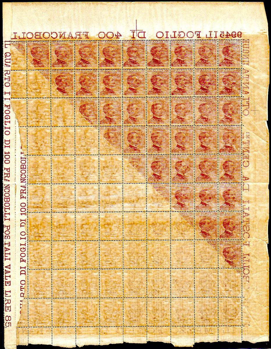 1924 - 7 1/2 cent. su 85 cent., I tipo, decalco del francobollo (135zb), foglio completo di 100 esemplari comprendente 47 esemplari con ... Leggi tutto