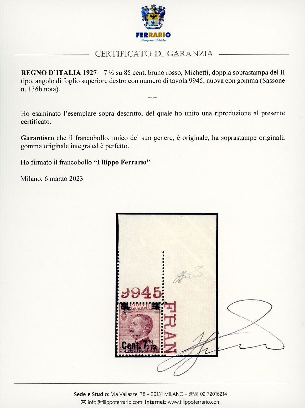 1927 - 7 1/2 su 85 cent. Michetti, doppia soprastampa del II tipo (136b nota), angolo di foglio superiore destro con numero di tavola 9945, nuovo, gomma originale integra, perfetto. Splendido e unico. Cert. Ferrario.