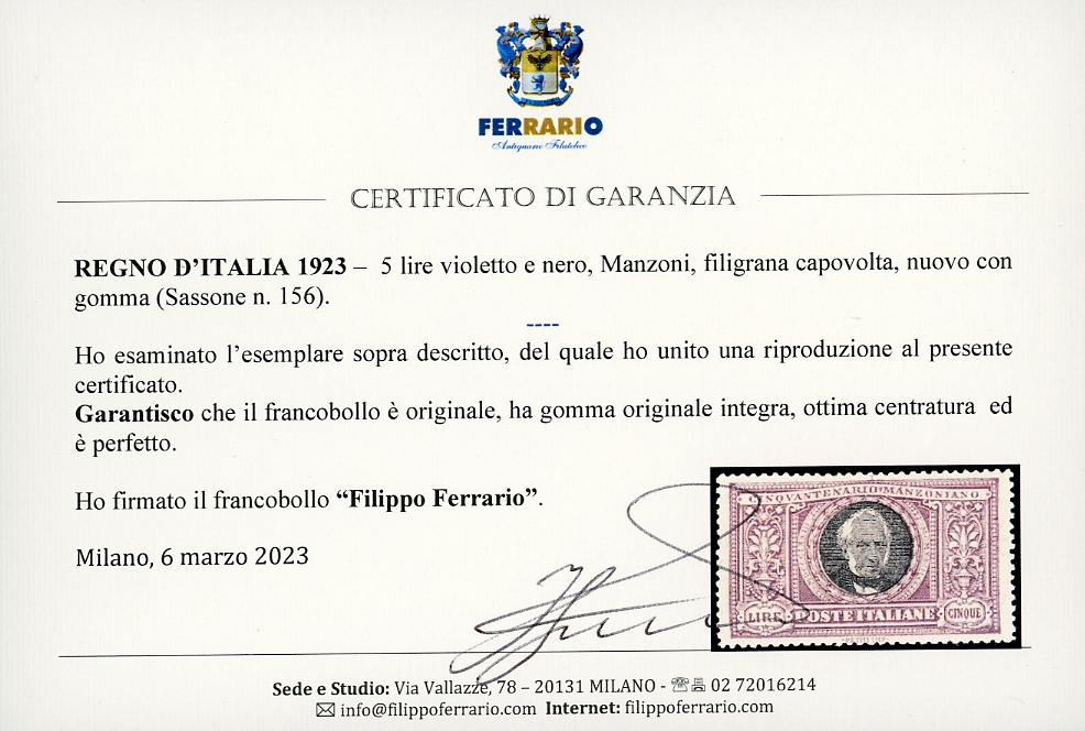 1923 - 5 lire Manzoni (156), ben centrato, gomma originale integra, perfetto, filigrana capovolta. E.Diena, G.Oliva, cert. Ferrario.