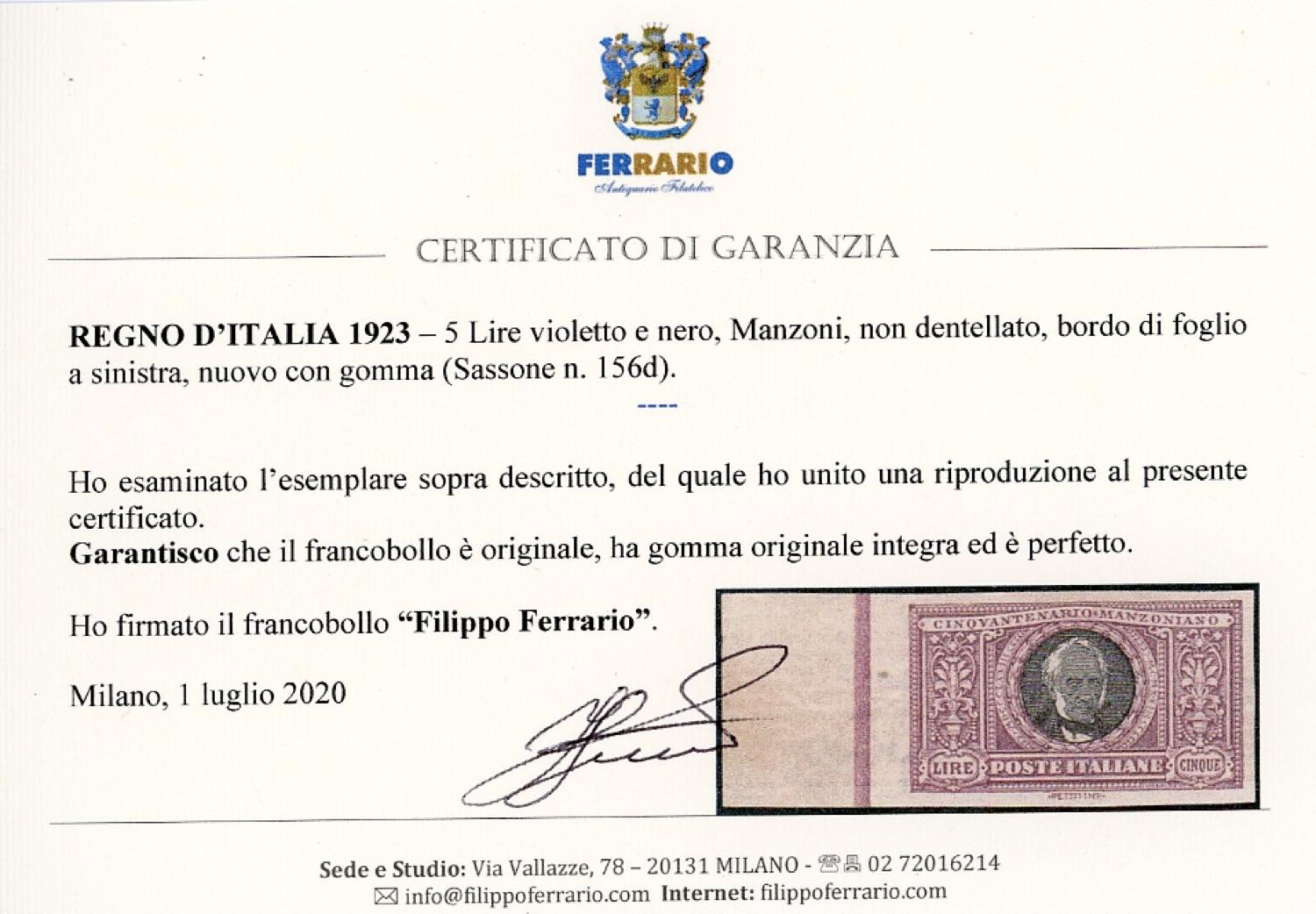 1923 - 5 lire Manzoni, non dentellato (156d), bordo di foglio, gomma originale integra. Bellissimo! Cert. Ferrario.