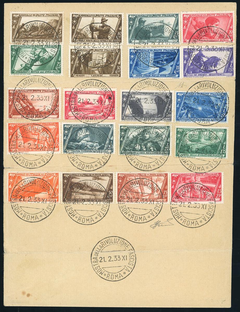 1933 - Marcia su Roma decennale, serie completa (325/340+A+E), usati su grande frammento con annullo originale commemorativo "Mostra della Rivoluzione Fascista 21/2/1933". Insieme raro! A.Diena, Ferrario.
