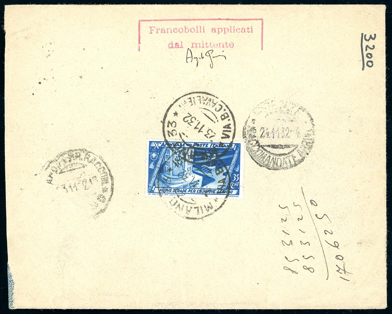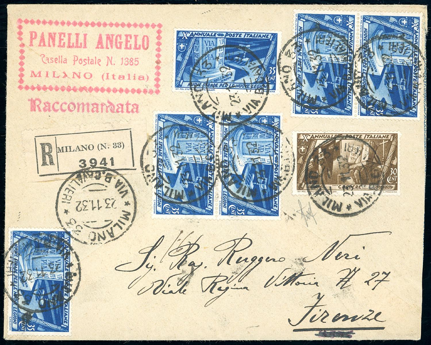 Lotto 1413 - 1932 - Raccomandata da Milano 23/11/1932 a Firenze, ...