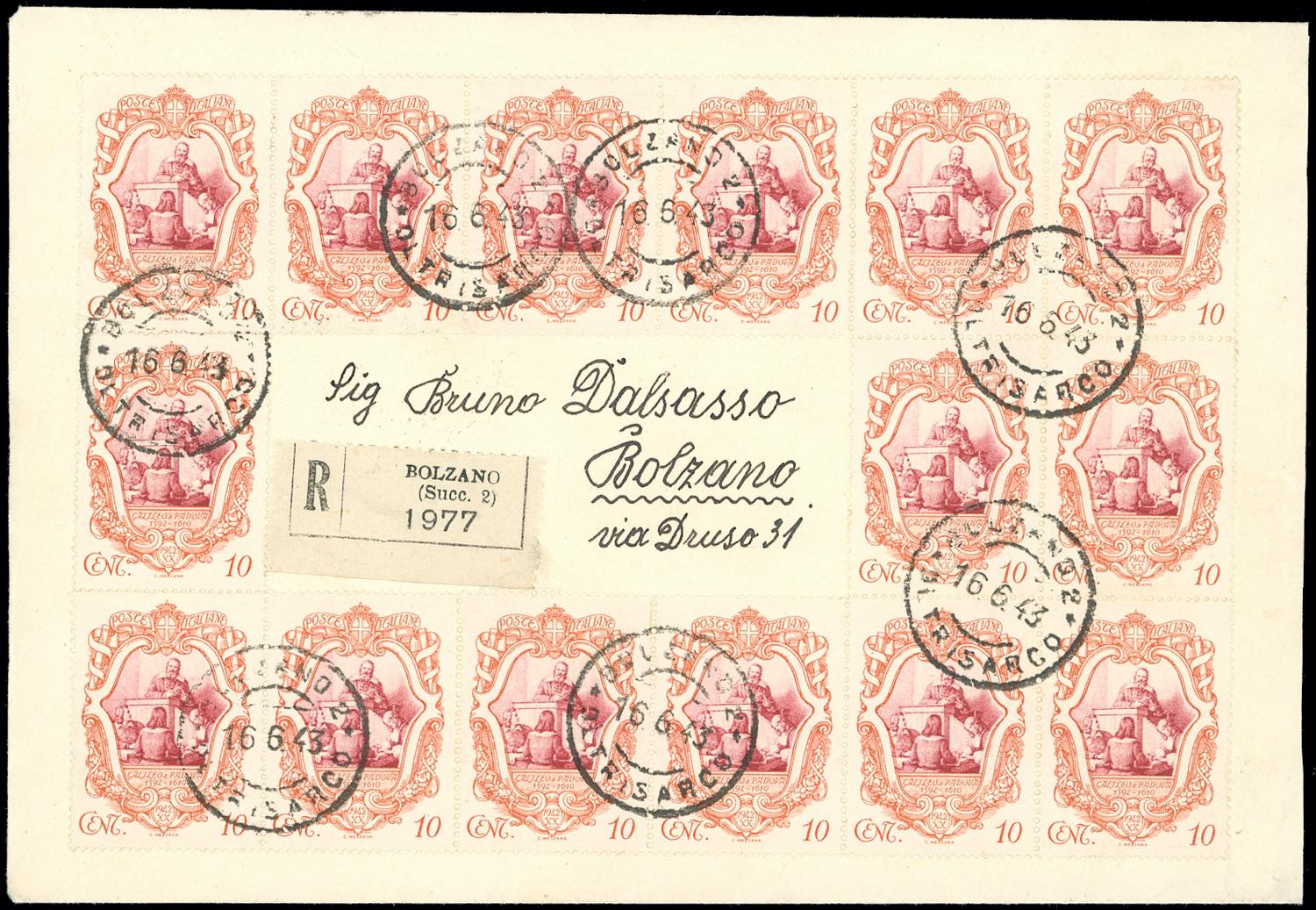 1943 - 10 cent. Galileo (462), 15 esemplari, ottimo stato, su busta raccomandata da Bolzano 16/6/1943 per città. Bella e coreografica affrancatura multipla monovalore.