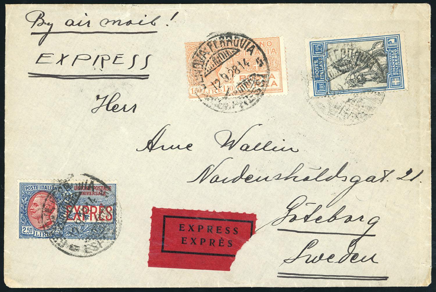 1928 - 1,50 lire Vittorio Emanuele III, 1,25 lire Filiberto, 2,50 lire espresso (6,235,E14), perfetti, su aerogramma per espresso da Genova 12/9/1928 per la Svezia.