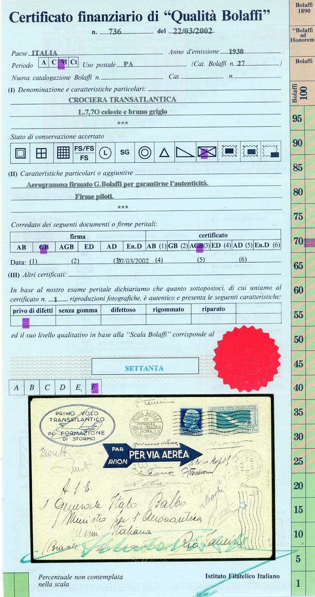1930 - 7,70 lire Crociera Balbo, 1,25 lire Imperiale (A25,253), perfetti, su aerogramma da Roma 15/12/1930 a Rio de Janiero, bollo speciale della Crociera e autografi dei piloti. G.Bolaffi, cert. Finanziario Bolaffi.