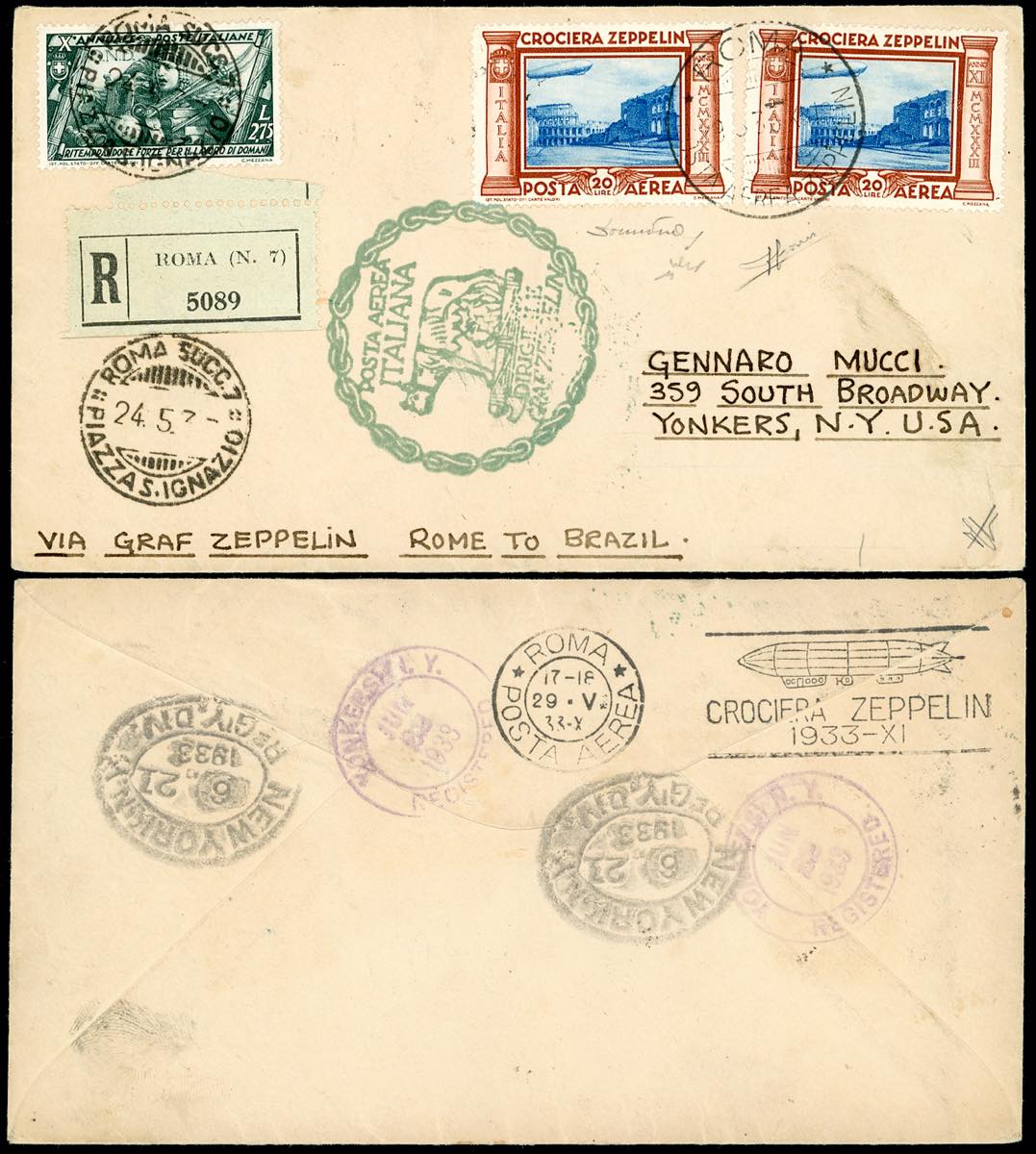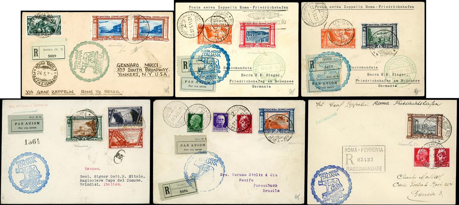 1933 - Zeppelin, serie completa (45/50), perfetti, su sei cartoline/buste con valori complementari, tutti con i bolli speciali della Crociera Zeppelin, firmate da noti periti. Per il raro 20 lire è presente un aerogramma con 2 esemplari, firmato Sorani. Raro insieme di ottima qualità.