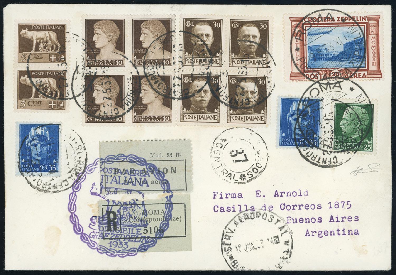 1933 - 20 lire Zeppelin (50), con complementari serie Imperiale, perfetti, su aerogramma raccomandato da Roma 29/5/1933 per l'Argentina, bolli speciali della Crociera Zeppelin sul fronte e al verso. Non comune. Ferrario.