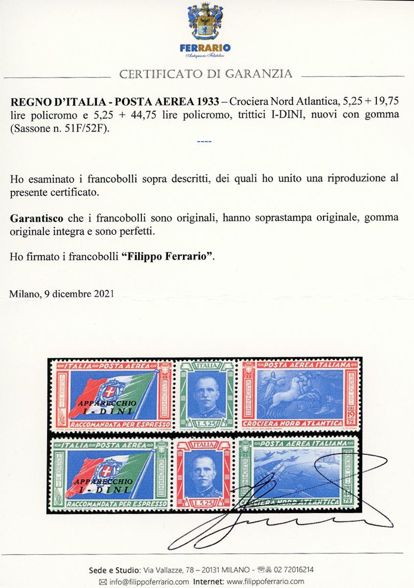 1933 - Trittici I-DINI (51F/52F), gomma originale integra, perfetti. Cert. Ferrario.