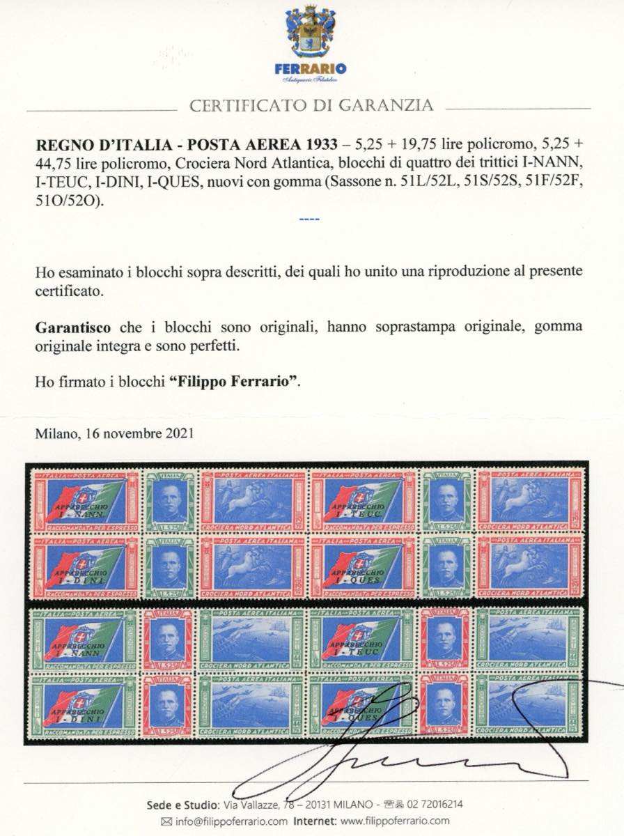 1933 - Trittici, blocchi di quattro con le sigle I-NANN, I-TEUC, I-DINI, I-QUES (51/52L,51/52S,51/52F,51/52O), gomma originale integra, perfetti. Cert. Ferrario.