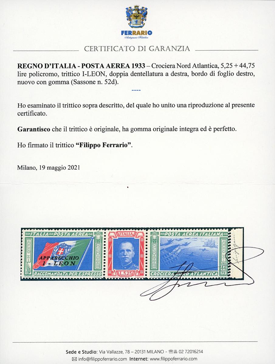 1933 - 5,25 + 44,75 lire Trittico I-LEON, doppia dentellatura a destra (52d), bordo di foglio, gomma originale integra, perfetto. Raro, 20 esemplari noti, di cui solo due con questa sigla. Cert. Diena e Ferrario.