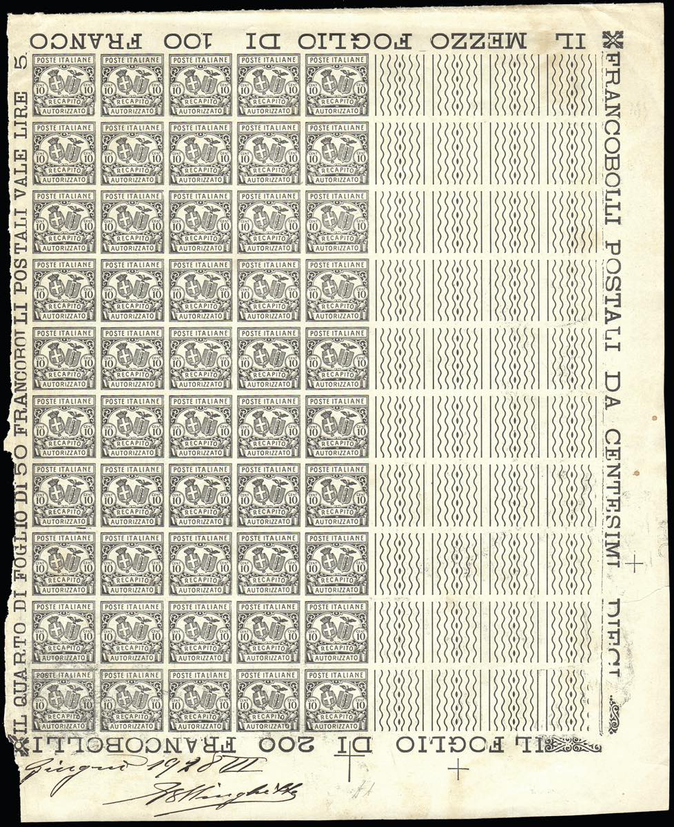 1928 - 10 cent., prova di macchina in nero (1), quarto di foglio completo di 50 esemplari, non dentellato, senza gomma come sempre, ottimo stato. Molto raro! A.Diena.